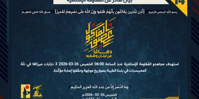 دفاعًا عن لبنان وشعبه، استهدف مجاهدو المُقاومة الإسلاميّة عند الساعة 06:00 الخميس 26-03-2026 3 دبّابات ميركافا في تلّة المحيسبات في بلدة الطيبة بصواريخ موجّهة وحقّقوا إصابة مؤكّدة.