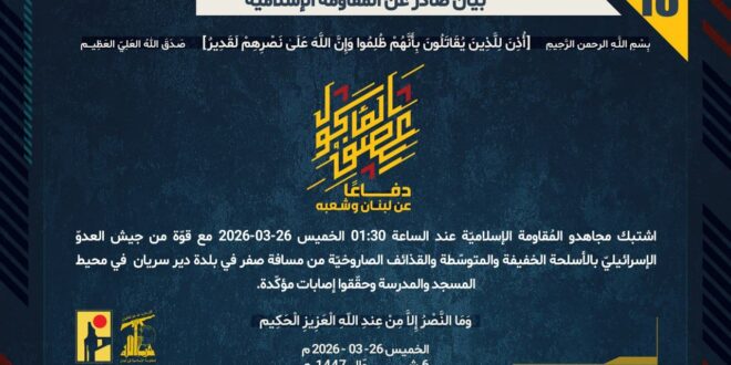 دفاعًا عن لبنان وشعبه، اشتبك مجاهدو المُقاومة الإسلاميّة عند الساعة 01:30 الخميس 26-03-2026 مع قوّة من جيش العدوّ الإسرائيليّ بالأسلحة الخفيفة والمتوسّطة والقذائف الصاروخيّة من مسافة صفر في بلدة دير سريان في محيط المسجد والمدرسة وحقّقوا إصابات مؤكّدة.