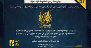 دفاعًا عن لبنان وشعبه، وفي إطار التحذير الذي وجّهته المُقاومة الإسلاميّة لعددٍ من مستوطنات شمال فلسطين المحتلة، استهدف مجاهدو المُقاومة الإسلاميّة عند الساعة 13:00 الخميس 26-03-2026 مستوطنة أفيفيم بصليةٍ صاروخيّة.