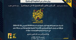 دفاعًا عن لبنان وشعبه، استهدف مجاهدو المُقاومة الإسلاميّة عند الساعة 12:30 الخميس 26-03-2026 دبّابة ميركافا في بلدة القنطرة بمحلّقة انقضاضيّة وحقّقوا إصابة مؤكّدة.
