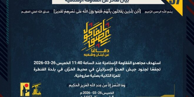 دفاعًا عن لبنان وشعبه، استهدف مجاهدو المُقاومة الإسلاميّة عند الساعة 11:40 الخميس 26-03-2026 تجمّعًا لجنود جيش العدوّ الإسرائيليّ في محيط الخزّان في بلدة القنطرة للمرّة الثانية بصلية صاروخيّة.