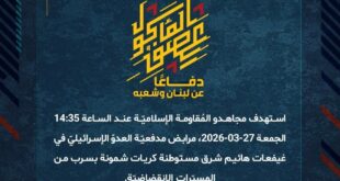 دفاعًا عن لبنان وشعبه، استهدف مجاهدو المُقاومة الإسلاميّة عند الساعة 19:10 الخميس 26-03-2026 مرابض مدفعيّة العدوّ الإسرائيلي في مستوطنة إيلون بسربٍ من المُسيّرات الانقضاضيّة.