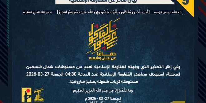 دفاعًا عن لبنان وشعبه، وفي إطار التحذير الذي وجّهته المُقاومة الإسلاميّة لعددٍ من مستوطنات شمال فلسطين المحتلة، استهدف مجاهدو المُقاومة الإسلاميّة عند الساعة 04:30 الجمعة 27-03-2026 مستوطنة كريات شمونة بصليةٍ صاروخيّة.