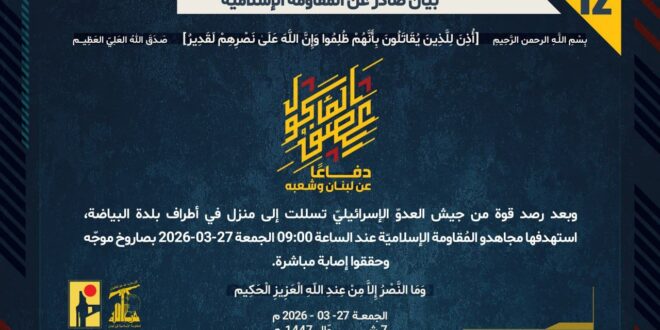 دفاعًا عن لبنان وشعبه، وبعد رصد قوة من جيش العدوّ الإسرائيليّ تسللت إلى منزل في أطراف بلدة البياضة، استهدفها مجاهدو المُقاومة الإسلاميّة عند الساعة 09:00 الجمعة 27-03-2026 بصاروخ موجّه وحققوا إصابة مباشرة.