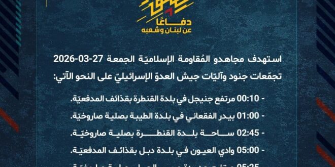 دفاعًا عن لبنان وشعبه، استهدف مجاهدو المُقاومة الإسلاميّة الجمعة 27-03-2026 تجمّعات جنود وآليّات جيش العدوّ الإسرائيليّ على النحو الآتي: