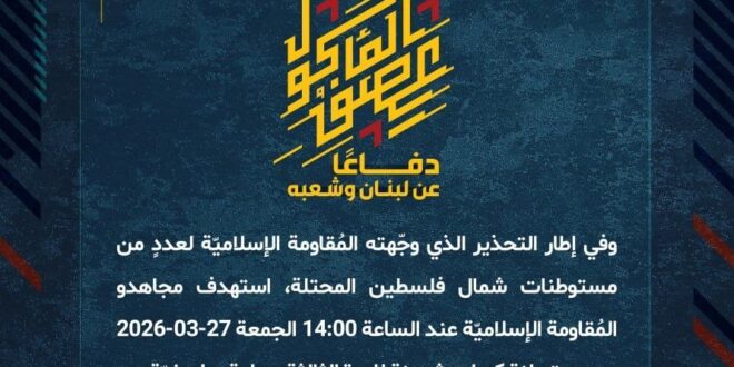 دفاعًا عن لبنان وشعبه، وفي إطار التحذير الذي وجّهته المُقاومة الإسلاميّة لعددٍ من مستوطنات شمال فلسطين المحتلة، استهدف مجاهدو المُقاومة الإسلاميّة عند الساعة 14:00 الجمعة 27-03-2026 مستوطنة كريات شمونة للمرة الثالثة بصليةٍ صاروخيّة.