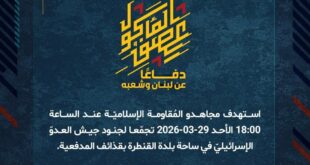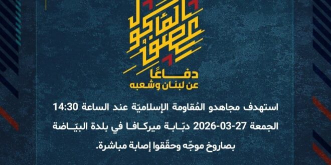 دفاعًا عن لبنان وشعبه، استهدف مجاهدو المُقاومة الإسلاميّة عند الساعة 14:30 الجمعة 27-03-2026 دبّابة ميركافا في بلدة البيّاضة بصاروخ موجّه وحقّقوا إصابة مباشرة.