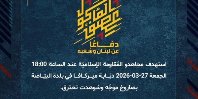 دفاعًا عن لبنان وشعبه، استهدف مجاهدو المُقاومة الإسلاميّة عند الساعة 18:00 الجمعة 27-03-2026 دبّابة ميركافا في بلدة البيّاضة بصاروخ موجّه وشوهدت تحترق.