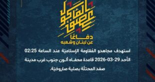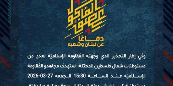 دفاعًا عن لبنان وشعبه، وفي إطار التحذير الذي وجّهته المُقاومة الإسلاميّة لعددٍ من مستوطنات شمال فلسطين المحتلة، استهدف مجاهدو المُقاومة الإسلاميّة عند الساعة 15:30 الجمعة 27-03-2026 مستوطنة كريات شمونة للمرّة الرابعة بصليةٍ صاروخيّة.